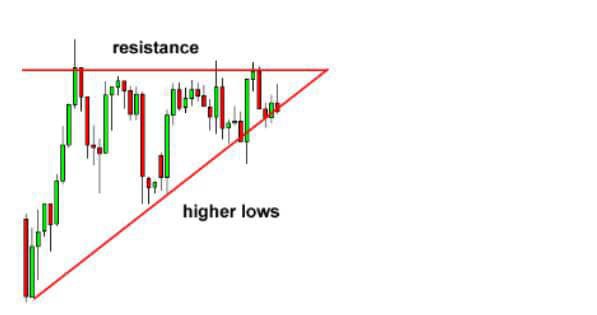 This type of triangle chart pattern occurs when there is a resistance level and slope of a higher low What happens during this time is that there is a certain level that the buyers cannot seem to exceed. However, they are gradually starting to push price up as evident by the higher lows