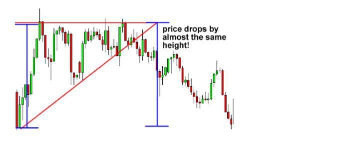 See how price broke down to the downside? That means there are more forex traders desperate to be short than be long! They pushed the price down to break the trend line, indicating that a downtrend may be in the cards. Just like in the other forex trading chart patterns we discussed earlier, the price movement after the breakout is approximately the same magnitude as the height of the formation.