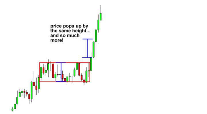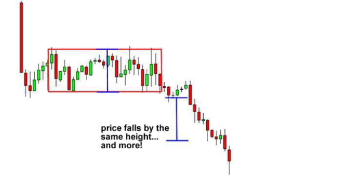 In this example, price broke the bottom of the rectangle chart pattern and continued to shoot down. If we had a short order just below the support level, we would have made a nice profit on this trade. price falls by the same height... and more Here's a tip: Once the pair falls below the support, it tends to make a move that is about the size of the rectangle pattern. In the example above, the pair moved beyond the target so there would have been a chance to catch more pips!