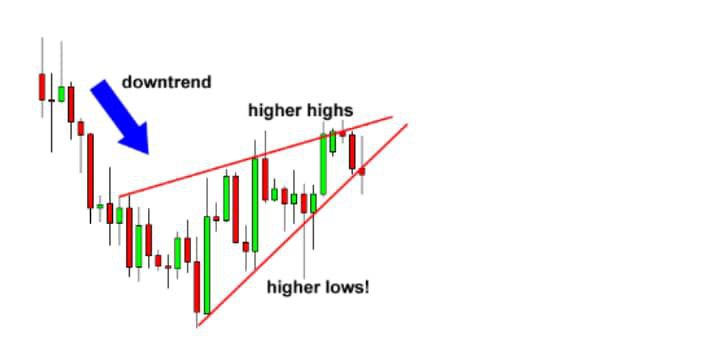 In this example the falling wedge serves as a reversal signal. After a downtrend the price made lower Highs and lower lows