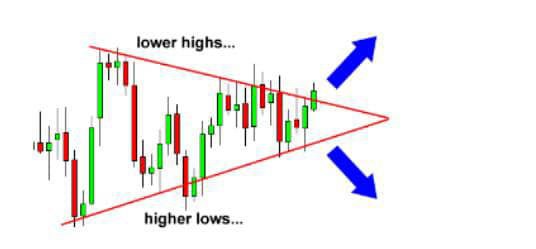In the chart above, you can see that the price is gradually making lower highs which tell us that the sellers are starting to gain some ground against the buyers. Now most of the time, and we do say MOST, the price will eventually break the support line and continue to fall. However, in some cases, the support line will be too strong, and the price will bounce off of it and make a strong move up. The good news is that we don't care where the price goes. we just know that it's about to go somewhere. In this case, we would place entry orders above the upper line (the lower highs)and below the support line.